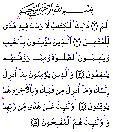 (The Cattle) The starting verses in Surah Baqarah describe the people who benefit from the Divine Guidance and those who do not. The surah begins by declaring its own divine origin and authority: 'Alif Lam Meem. This is the Book (of Allah), there is no doubt about it' (v 1-2). And the placement of this proclamation at the very beginning sets the tone for the reader. Once the reader is able to comprehend the magnificence of this book, he can now move forward with full reverence, awe, yearning, and a willingness to understand and to submit. To what purpose has this book been revealed? To provide guidance. Guidance for whom & guidance towards what? To guide the Muttaqin, those who have Taqwa (i.e. possess the quality of piety, God-consciousness, righteous living). It is also meant to guide the seekers who strive to become Muttaqin. It would be prudent to remind oneself at this point that the the scope of developing Taqwa is endless. 'Those who are willing to be guided, He advances them in guidance, and in their Taqwa (Muhammad 47:17).' The characteristics of the Muttaqin are laid out, next. "Those who believe in what lies beyond the reach of human perception"(v 3). The concept of the imperceptible is a decisive factor in distinguishing man from animals. Materialistic thinking, ancient as well as modern, has tended to drag man back to an irrational existence, with no room for the spiritual (the unseen), where everything is determined by sensory means alone. What is peddled as 'progressive thought' is no more than dismal regression. Sadly enough like the 'materialistic' Muslim, there also exists the 'progressive' ones who often share the commonality of denying what they can't perceive, whether it be the wisdom behind a ruling in the Shariah or be it the miracles from the life of the Prophet. Those who "observe prayer" (v 3), revere and worship none but God Almighty. They never debase themselves by worshipping anyone or anything else. They turn to the real and ultimate power in this world, humbling their hearts and souls to Him alone. Their ties with God give them power over other creatures and feed their consciousness with moral strength and fear of God. Prayer is an essential element in the building of a believer's character and shaping his concepts, feelings and behaviours and in linking them directly with God. "And give of what we bestow upon them" (v 3). This implies a recognition on the part of the believer, that what they own and possess is a gift and favour from God. It is not of their own making. Such a belief brings mercy and benevolence towards the weak and the poor, and mutual fellowship and a true spirit of brotherhood and human community among all. The outcome is to eliminate greed and fill people's heart with compassion and humanity. "Who believe in what has been revealed to you and what was revealed before you." (v 4). This a characteristic of the Muslim community, the rightful heir to, and custodian of, God's message and legacy of all Prophets since the dawn of human life. It allows us to feel proud of being the recipient of God's pure and universal guidance, which remains a bright shining star that is never extinguished, even in the darkest days of human history. "And are certain of the Hereafter" (v 4). This characteristic of the God-fearing links the present life with the life to come; the beginning with the end; deed with reward. It provokes in man, the feeling that there exists a purpose to his existence. And it reassures him by affirming that full justice is certain to come, and thus inspires man to seek to do good, with total confidence in God's justice and mercy. The passage aptly concludes with the comment: "Those who follow their Lord's guidance, and they shall surely prosper." (v 5). The believers in Makkah and Medina, adhered to God's guidance and they were successful. For those who wish to follow their footsteps, the route remains clearly marked. May Allah enable us to be of the Muttaqin. Source: |
