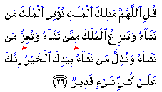 This verse expresses the natural result of the oneness of God. Since there is only a single deity, He is then the only Master, "the Sovereign of all dominion" Who has no partners. He gives whatever portion He wishes of His dominion to whomever He wants of His servants. What is given becomes simply like a borrowed article. Its owner retains his absolute right of taking it back whenever he wants. No one, then, has any claim of original dominion giving him the right of absolute power. It is simply a received dominion, subject to the terms and conditions stipulated by the original Sovereign. If the recipient behaves in any way which constitutes a violation of these conditions, his action is invalid. Believers have a duty to stop him from that violation in this life. In the life to come, he will have to account for his violation of the terms stipulated by the original Sovereign. He is also the One Who exalts whom He wills and abases whom He wills. He needs no one to ratify His judgement. No one grants protection against the will of God, and no one has the power to prevent His will taking its full course. His power is absolute and His control is total. The authority of God ensures the realisation of all goodness. He exercises it with justice. When He gives dominion to anyone or takes it away from him, He does so with justice. Similarly, it is with justice that He exalts or abases any of His servants. This ensures real goodness, in all situations. Source: |