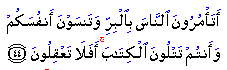 This may have well been directed at the Jews of Madinah on certain specific occasions, but it applies to all believers and religious leaders of all groups and generations. When religioius teaching becomes a mere "profession" it loses its fervour; those who take it up begin to say things they do not believe and their actions tend to become divorced from their words. This can lead them to twist facts and compromise ideas and principles to serve their interests and desires. Their rulings, pronouncements and opinions, or fatwas, may sound convincing but they are far removed from the spirit and the letter of the religion. The double standards of those who claim to represent a certain religion or ideology not only harm them personally, but also undermine the ideas and the religions they are advocating. They confuse people and weaken their trust and confidence in the religion, so that they lose interest in it. When people lose trust in their preachers, the preachers become even more diffident and arrogant. When they are not uttered with sincerity and conviction, words lose their impact. A man's beliefs are meaningless unless his actions and behaviour become a practical translation of those beliefs. When a man's conduct reflects his words, no matter how plain and ordinary these words are, people will trust him and take him seriously. His words draw their power and effect from the sincerity and honesty with which they are being uttered, not from the rhetoric or eloquence in which they are delivered. They assume a force of their own. Source: |