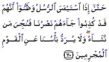 This is Allah's way with regard to the Mission brought by the Prophets: there can be no escape from hardships and inflictions until nothing of the strength and energy is left for expenditure. It is only when every apparent means to which people cling, and depend on, have disappeared, that help comes, relieving those who deserve to be relieved, while others - the criminal minded, and the arrogant ones - have the destruction delivered on themselves, with no help and relief from any quarter.
