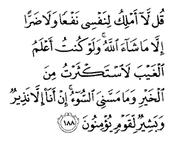 "Say,  'I  hold  not  for    myself  [the  power  of]  benefit  or  harm,  except  what Allah has    willed. And  if  I  knew  the  unseen,  I  could  have  acquired  much    wealth,  and  no  harm  would have  touched  me.  I  am but a    warner  and  a  bringer  of  good  tidings  to  a  people who    believe.'"
