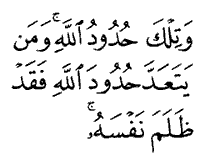 There are, however, many cases in which the setting of a 'bound' is understandable in terms of the social welfare; this occurs when the particular 'bound' is clearly calculated to produce some direct benefit to the life of people in a community. Thus God decrees in the Quran that there should be no usury, and He designates usury by the name of zulm (wrongdoing, oppression). The rules concerning divorce, which the above verse refers to, may be taken as another example.