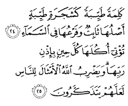 "A good word is as a good tree: its roots firm and its branches in the sky. It brings forth fruit in every season, by the Leave of its Lord. God sets forth parables for mankind, that haply they may remember."