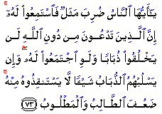 "O men! here is a parable set forth! Listen! Those on whom, besides Allah, you call, could not create (even) a fly, if they all met together for the purpose. And if the fly would snatch away anything from them, they would have no power to get it back from the fly. Feeble are those who petition and those whom they petition."