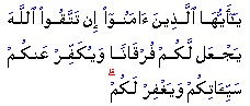 "Believers! if you fear Allah he will grant you a criterion and will cleanse you of your sins and forgive you."