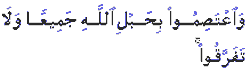 Commentary: By the 'rope of Allah' is meant that agreement and covenant which was drawn up between us and the Almighty Allah - the covenant of the Quran. This opinion is based on a hadith in which the Prophet, peace be upon him, said: "The Book of Allah: It is the Rope of Allah that has been extended down from the heavens to the earth." (Ibn Jarir, Qurtubi) Imam Razi comments: "Since the path that believers are required to take is a very narrow one, the likelihood of a person slipping off always remains high, except in case of him who holds a rope that runs across." The command to hold fast to the Quran implies that we have been directed to follow the code prescribed through the Quran for our individual as well as collective life. In every difficult situation involving our convictions and ideaology the Quran should be our guiding star for steering us to safety. By 'be not disunited' it is implied that we must not lose our grip on the Rope of Allah and fall into the snare of prejudice by splitting into groups led by different Imams and leaders, whereby truth and guidance, instead of being radiated directly by the Quran might appear to become the private property of certain individuals and personalities. Mufti Shafi remarks: "When we speak of unity of ranks, we know that it cannot be attained without the unity of ideas, faiths and objectives. That will come from the Quran and the Sunnah. It is only when we hold fast unto them, accepting them as the sole criteria, guide and judge, that the much sought after unity of ranks, will be achieved. Every other method will fail miserably." [Compiled from 'Juristic Differences' by Amin Ahsan Islahi, pp 14-15 and 'Tafsir Ishraq al-Maani' by Syed Iqbal Zaheer, Vol 2, pp. 89-90] |