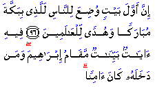 "The first House ever set up for mankind was indeed that at Bakkah, a blessed place, and a guidance unto all beings; wherein are clear signs - the place whereon Ibrahim stood; and whosoever enters it finds peace.”