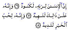 "And truly, he is passionate in his love for worldly riches". Man is a passionate self-lover. But he loves only what he imagines to be good for him: wealth, power and the pleasures of this world. This is his nature unless he has faith which changes his concepts, values and even his concerns. Faith changes his ingratitude to humble thankfulness. It changes his greed and miserliness to benevolence and compassion. It makes him aware of the proper values which are worthy of being the object of ambition and hard competition. Indeed these are much more exalted than money, power and mundane pleasures.