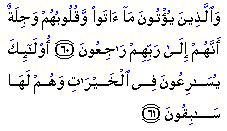 "And those who dispense their charity with their hearts full of fear, because they will return to their Lord; It is these who hasten in every good work, and these who are foremost in them."