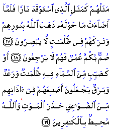 "Their similitude is that of a man who kindled a fire; when it lighted all around him, Allah took away their light and left them in utter darkness. So they could not see. Deaf, dumb, and blind, they will not return (to the path). Or (another similitude) is that of a rain-laden cloud from the sky: in it are zones of darkness, and thunder and lightning: they press their fingers in their ears to keep out the stunning thunderclap, the while they are in terror of death. But Allah is ever round the rejecters of Faith! The lightning all but snatches away their sight; every time the light (helps) them, they walk therein, and when the darkness grows on them, they stand still. And if Allah willed, He could take away their faculty of hearing and seeing; for Allah hath power over all things."
