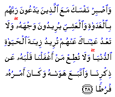"And keep your soul content with those who call on their Lord morning and evening, seeking His presence: and let not your eyes pass beyond them, seeking the pomp and glitter of this life; and pay no heed to one whose heart We have permitted to neglect the remembrance of Us, one who follows his won desires, and whose [transgressions] have gone beyond all bounds."