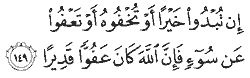 "Whether you publicize a good deed or hide it or pardon a (personal) offense (done against you), know that God has the power to pardon (all sins)."