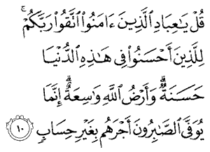 "Say: You servants of Mine who believe! Fear your Lord! Those who do good in this world will have a good reward. Wide is God's earth. Those who are patient in adversity will be given their reward in full, beyond reckoning."