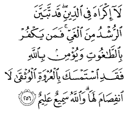"There is to be no compulsion in religion. Surely, the right direction has been made clear and distinct from error. He who rejects false deities and believes in God has grasped a firm handhold which will never break. And God is Hearing and Knowing."