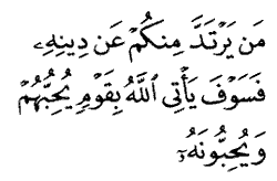 "If any from among you turns back from his Faith, soon will God produce a people whom He will love as they will love Him."
